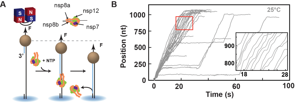 The Dulin lab has pioneered single molecule biophysics techniques to monitor RNA synthesis by the coronavirus RdRp complex to reveal the complex dynamics regulating coronavirus replication and transcription. We have developed the first single-molecule assay to observe RNA synthesis in real-time at near single base resolution and over 1 kb long template of the coronavirus polymerase (Figure 2).