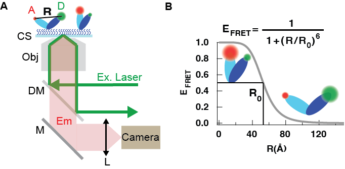 Figure 3: Schematic of a TIRF-based single-molecule FRET assay (not to scale). (A) An excitation laser beam (green, Ex. Laser) is focused in the back focal plane of a microscope objective (Obj) and is slightly off centered from the objective optical axis to provide the conditions for total internal reflection. This creates an evanescant wave at the interface of the coverslip (CS) and of the above aqueous solution. A molecule labeled with a donnor dye (green, D) and an acceptor dye (red, A) on its two domains (dark blue and light blue, respectively) is attached to the CS surface. For a distance R from A to D comprised between 2 and 10 nm, excitation energy from D is transfered non radiatively to A. Consequently, A emits fluorescence photons that are collected by the Obj. and separated from the Ex. laser photons with a dichroic mirror (DM) and projected on a sensitive camera with a tube lens (L). (B)FRET efficiency E as a function of a distance R between the donnor and the acceptor. R0 is the Forster radius.