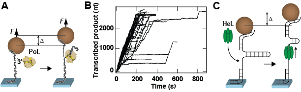 Figure 2: Description of experiments performed with magnetic tweezers. (A) A dsRNA attaches a magnetic bead to the surface. One strand has a free 3’-end that is used by the polymerase (Pol.) to initiate transcription. Following successful initiation, the polymerase activity converts the dsRNA tether into ssRNA. This activity changes the distance from the bead to the surface by ∆. (B) Transcription activity by P2 polymerase versus time monitored using parallelized detection, yielding 52 traces in a single experiment. (C) A hairpin attaches the magnetic bead to the surface. Preceding the stem of the nucleic acid hairpin, a single-stranded region is used as a loading site for the enzyme of interest, here a hexameric helicase (Hel.). After binding on the loading site, the helicase unwinds the stem of the hairpin, increasing the distance from the bead to the surface by ∆. Both experiments in (A) and (C) rely on the change in extension of the tether to demonstrate enzymatic activity.