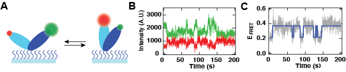 For example, one can label with a FRET pair the two domains of a surface-attached biomolecule that experiences stochastic conformational changes between two states (Figure 4A). The magnitude of the conformational change is translated into the anti-correlated intensities of the donor and acceptor (Figure 4B). Using custom algorithm specialized in detecting step-like changes in FRET efficiency, e.g. Hidden Markhov Modelling (12), the dwell times of each state can be recovered (Figure 4C). From these dwell times, one builds up the dwell time distributions and models the kinetics of conformational change.